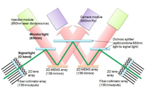 能够实现OCS的,从原理上看当前主流三种方案:分别为MEMS 微镜、数字液晶(如 LCoS/DMD 类空间光调制)、压电陶瓷(Piezo)、硅光波导等。几个技术路线都有厂商在进行尝试。目前,谷歌Palomar OCS 基于MEMS 方案,通过2D 光纤准直器阵列进入光学核心,采用2D MEMS 反射镜达到折叠光路的效果。