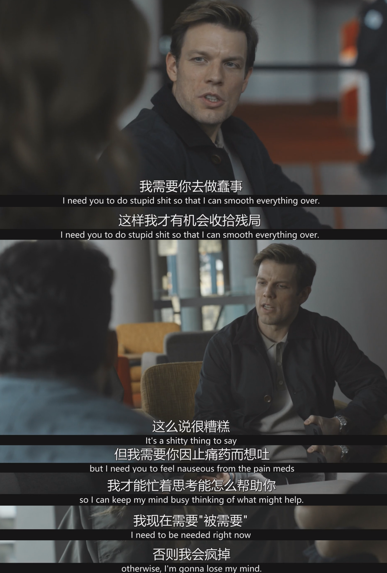 彼得的支配性男性气质不仅体现在自己的小家庭中,更如一张无形的网,笼罩着他的弟弟妹妹。他一直告诉残疾的弟弟不符合先进脊椎手术的资格,使弟弟不得不依赖自己生活。真相却是,彼得私自隐瞒了弟弟作为手术候选人的事实,他害怕手术成功后弟弟就会离开他,不再需要他的照顾。彼得也一直欺瞒着妹妹。童年时,彼得伸脚绊倒弟弟导致其脊椎重伤,而妹妹因为当时在追逐弟弟,误以为是自己的责任,并为此背负了二十年的罪恶感,在罪恶感下自暴自弃、自甘堕落。彼得对弟弟妹妹直言:“我需要你(妹妹)去做蠢事,这样我才有机会收拾残局……我需要你因止痛药而想吐,我才能忙着思考能怎么帮助你,我现在需要被‘需要’,否则我会疯掉。”他通过操控信息、情感绑架与制造依赖,实现对弟弟妹妹的绝对支配,巩固了他作为家庭支柱的权威形象。
