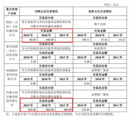 在读客文化申请上市时的一份文件中,《BUG》栏目查询到,西贝和华与华在2017年至2019年的交易费用分别为480万元、360万元和420万元。该文件也刊载了得到与华与华的交易费用,2018年为440万元,2019年为40万元。
