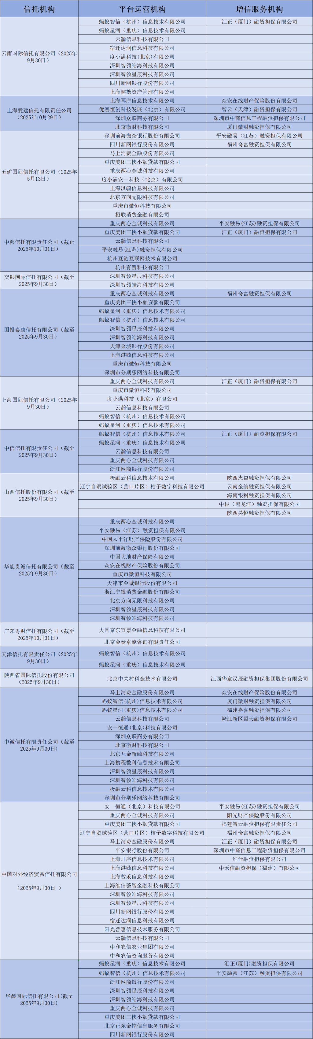 多家信托公司披露互联网助贷业务合作机构名单。